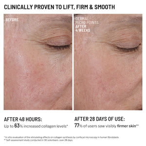 Inspired by the effects of microneedling, this innovative collagen-boosting gel formula mimics the benefits of the procedure — without the needles. Natural Dermal Micro-points help renew and revive the skin, paired with skin-lifting actives and anti-wrinkle peptides that penetrate the skin’s surface to boost collagen, even texture, and smooth fine lines. Natural spicules — microscopic structures — create 3 million microchannels within 5 minutes in the epidermis. Beyond enhancing ingredient delivery deep into the skin, they replicate the benefits of microneedling by stimulating the body's natural healing process.