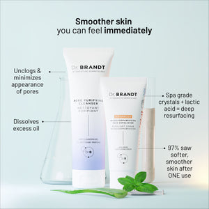 ADVANCED MICRODERMABRASION – Inspired by Dr. Brandt’s signature in-office procedures, this dual-action exfoliator combines aluminum oxide crystals for physical exfoliation with lactic acid for chemical resurfacing. Improves texture, tone, radiance, and targets signs of aging, dullness, dark spots, uneven skin tone, and rough texture.