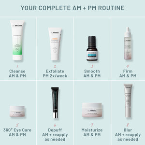 AM & PM. Apply a grain of rice amount on your finger, any less will not be enough, any more is too much and won't fully absorb into the skin.